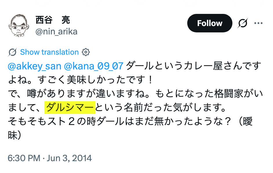 This all began with an interaction on Bluesky with Miguel Corti, who until 2022 worked on Capcom’s localization team in the Osaka office and says staffers asserted that Dhalsim really was named after a nearby restaurant. In fact, during a 2021 trip, Corti picked up a business card from this place — Dhall Curry Shop (カレーショップ ダール).