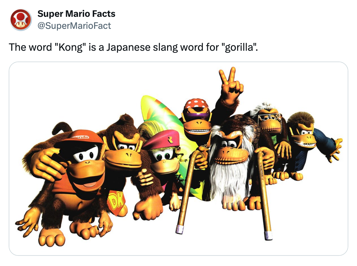 Unfortunately, none of these seem to be the case. I talked to Fatimah and asked my various Japanese-fluent friends if they’d ever come across kongu being used this way. No one could recall hearing or reading this. This is not to say that Shigeru Miyamoto is the only person in all of Japan who might think this and that he just happened to crystallize his misunderstanding in one of the best-known video game brands of all time — although it would be really funny if this were the case. No, other Japanese-speakers have made this mistake as well, including this person on Twitter, this person on Quora and this person on Yahoo Answers. It just doesn’t seem especially widespread. For all I know, it could be a generational thing, and Miyamoto is the most famous member of his cohort to admit to ever thinking this.