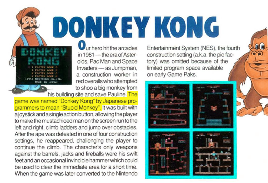 So yeah, despite the fact that urban legends spread quickly and without regard for critical thinking, this is one case in which they seem to have lost traction as a result of a more accurate narrative getting out. I don’t know whether to credit Miyamoto, David Sheff or know-it-all video game nerds who tell people “Yeah, it’s actually *not* a translation error” for this, but at the very least, the urban legends are not the only explanations floating around out there if someone puts “donkey kong name origin” in a search engine.