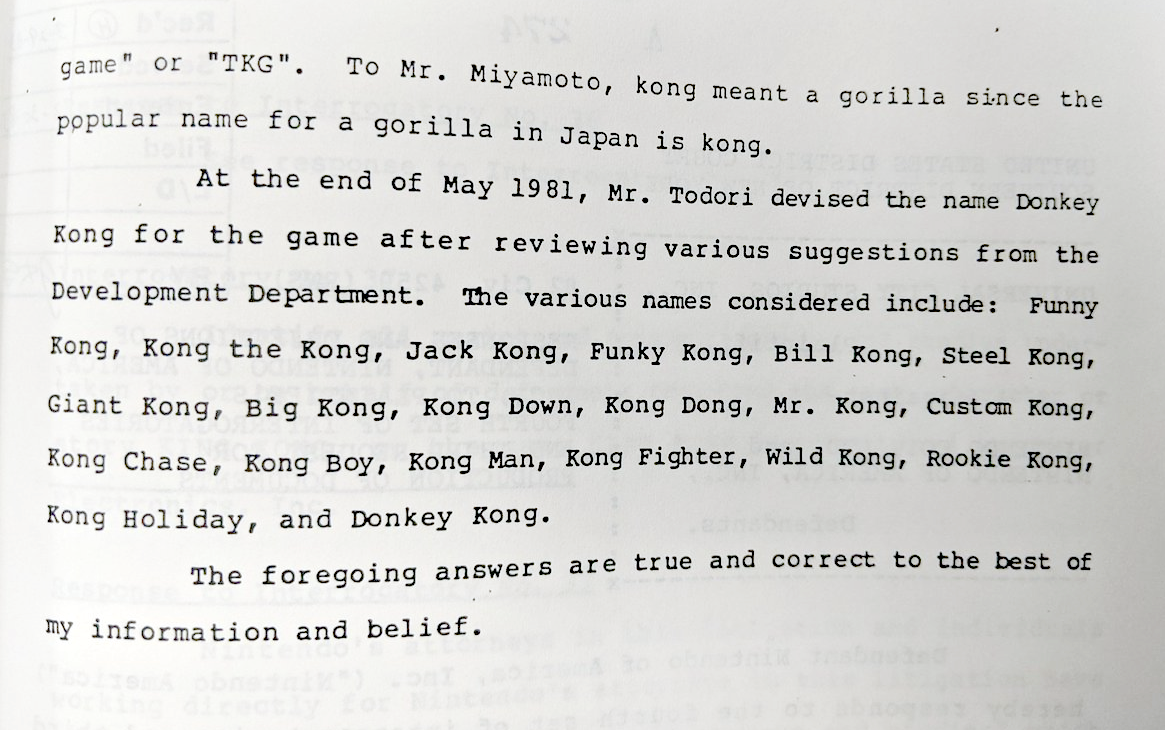 3. The lawsuit docs don’t fully capture how Donkey Kong got his name. People swear to tell the truth when giving a deposition, but that doesn’t mean that one person’s account of how something went down is necessarily going to be accurate. It’s just what they honestly recall. Given that Shinichi Todori gave his deposition in a relatively short time after Donkey Kong was released and given that his role in the process was relatively minor and extremely specific, it does seem like Todori would be recalling the events accurately, however. I suppose it’s also technically possible that both Todori and Miyamoto independently ended with the same name in very similar ways, although that seems extremely unlikely.