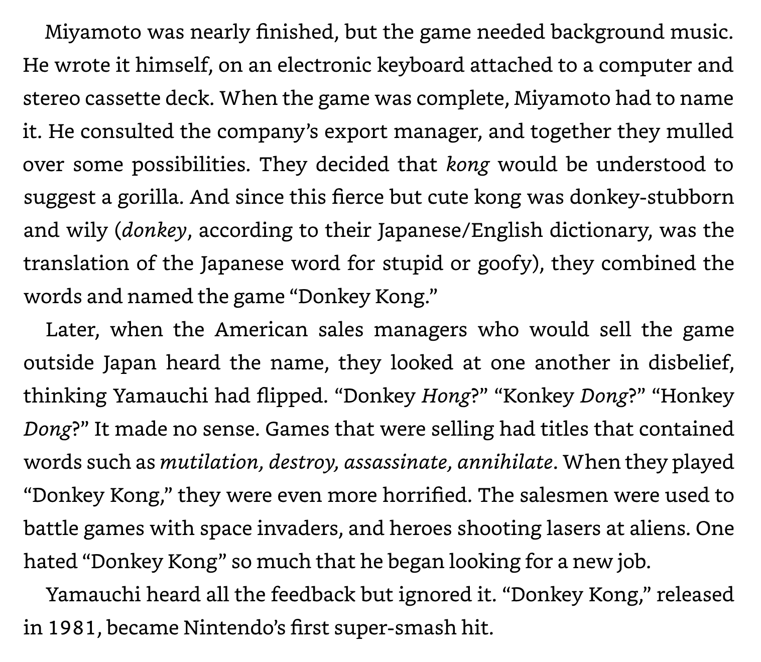 “It’s a mystery,” Miyamoto replied. “But I just liked the sound of it, so I decided to stand my ground on Donkey Kong. And within a year, everyone was saying Donkey Kong with no hesitation.”