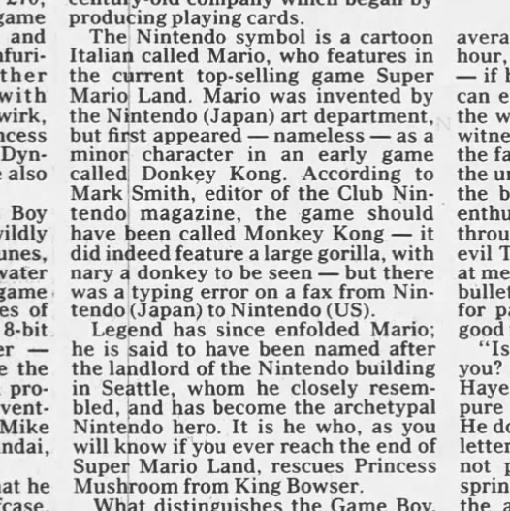 The most widespread folk etymology for Donkey Kong’s name seems to be the one addressed on its Snopes page: that it was a translation error, and that the character’s name was meant to be Monkey Kong. The version I recall hearing was a little more specific than someone intending one English animal name and then picking another, however; it was that Monkey became Donkey not as a result of human error but from a smudged fax. Though that version was almost assuredly circulating long beforehand, the oldest record I can find seems to be a December 23, 1991, article in The Daily Telegraph about the of Super Mario Land for the Game Boy being the hot item for that Christmas season in the United Kingdom. It cites a Mark Smith of a Nintendo Club magazine as explaining Donkey Kong’s name as a result of a misprinting fax machine, but make of that what you will, because the piece goes on to make at least two errors in the following paragraph.