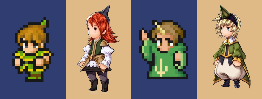 Speaking of the particulars of this class, one of the stranger elements of the Final Fantasy Summoner is the forehead horn, which doesn’t show up consistently. When it does, the horn is sometimes just an ornament (like in Final Fantasy III or any game where you can change a character’s class) and sometimes an actual horn growing out of their head (like Eiko in Final Fantasy IX). I looked around online and couldn’t find any indication that the horn was inspired by any preexisting work. And while I could argue that perhaps this animal part appearing on a human body might represent their connection to nature, beasts and monsters, my gut feeling is that it might actually be a result of the Final Fantasy III programmers needing a way to visually distinguish the Summoner sprite from the others. Like, “We only have so many pixels. I dunno. Stick a unicorn horn on it?”