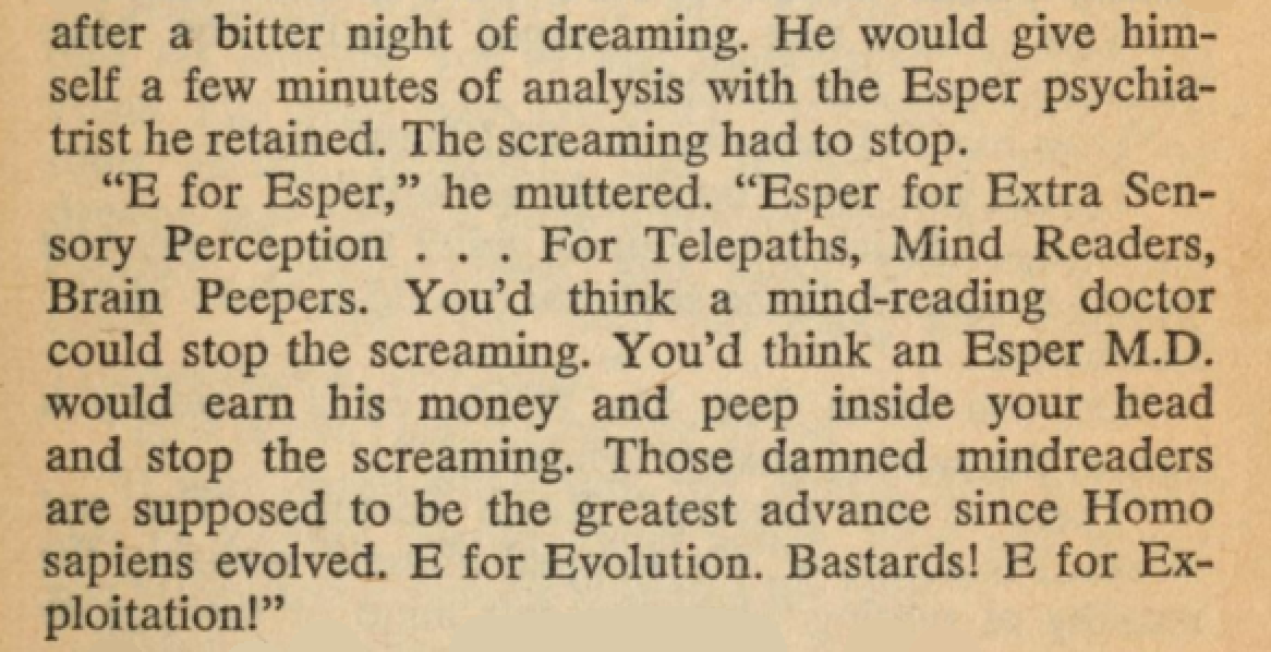 The origins of this term esper, however, are murky. The oldest usage of it in print that we can find is in the science-fiction short story “Oddy and Id” by Alfred Bester. First published in the August 1950 issue of the magazine Astounding Science Fiction, it tells the story of scientists investigating a young man who seems to have preternaturally good luck. But if you actually read the story, Esper is used in a casual, off-hand manner that doesn’t necessarily make it clear what it’s supposed to mean. To me, this passage reads like the author would have expected the reader to understand the term, which makes me think it must have appeared in print before this.