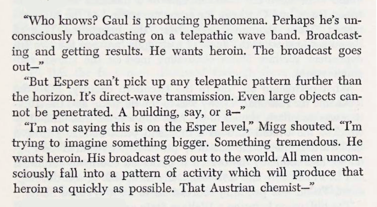 Bester used the term again in his 1953 novel The Demolished Man, a detective story taking place in a future in which telepathy is commonplace. On second reference, he makes it clear how he’s using the word. Possibly the audience for sci-fi novels was different from the one that bought sci-fi magazines.