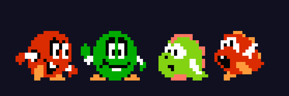 Perhaps it’s a subtle callback to Mario and Luigi that Bubbles’ default color is red but you get a green version of her if you do two-player mode? But then again, red and green are complimentary colors and they’re used in opposition in a lot of situations that aren’t Super Mario-coded. And I don’t know if this proves or refutes anything, but Devil World does exactly the opposite, with Tamagon being green by default but the player two version being red.