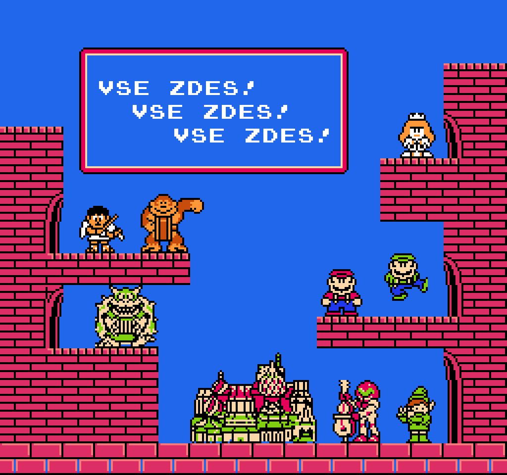 Yes, as you progress through the game’s B mode, you’re rewarded by gradually getting more and more Nintendo mascots doing a hootenanny outside St. Basil’s Cathedral in Moscow. You get Mario and Luigi doing a Russian dance, Link playing his trusty recorder, Samus on a cello for some reason, toe-tapping Bowser on an accordion, Pit playing the violin, Donkey Kong punching the crap out of a drum and finally a princess politely clapping. (I’m told that it’s Peach and I have no reason to question it, but there’s nothing about the way she’s styled that couldn’t just as easily be Zelda. It really doesn’t look like anyone in particular.) It might sound dumb to say this today, but as a kid, I thought this was very exciting because I’d never seen anything like this before. In my head, at least, the Super Mario stuff stayed over here, and the Legend of Zelda stuff was kept over there, and this was just the way of the pixelated world.