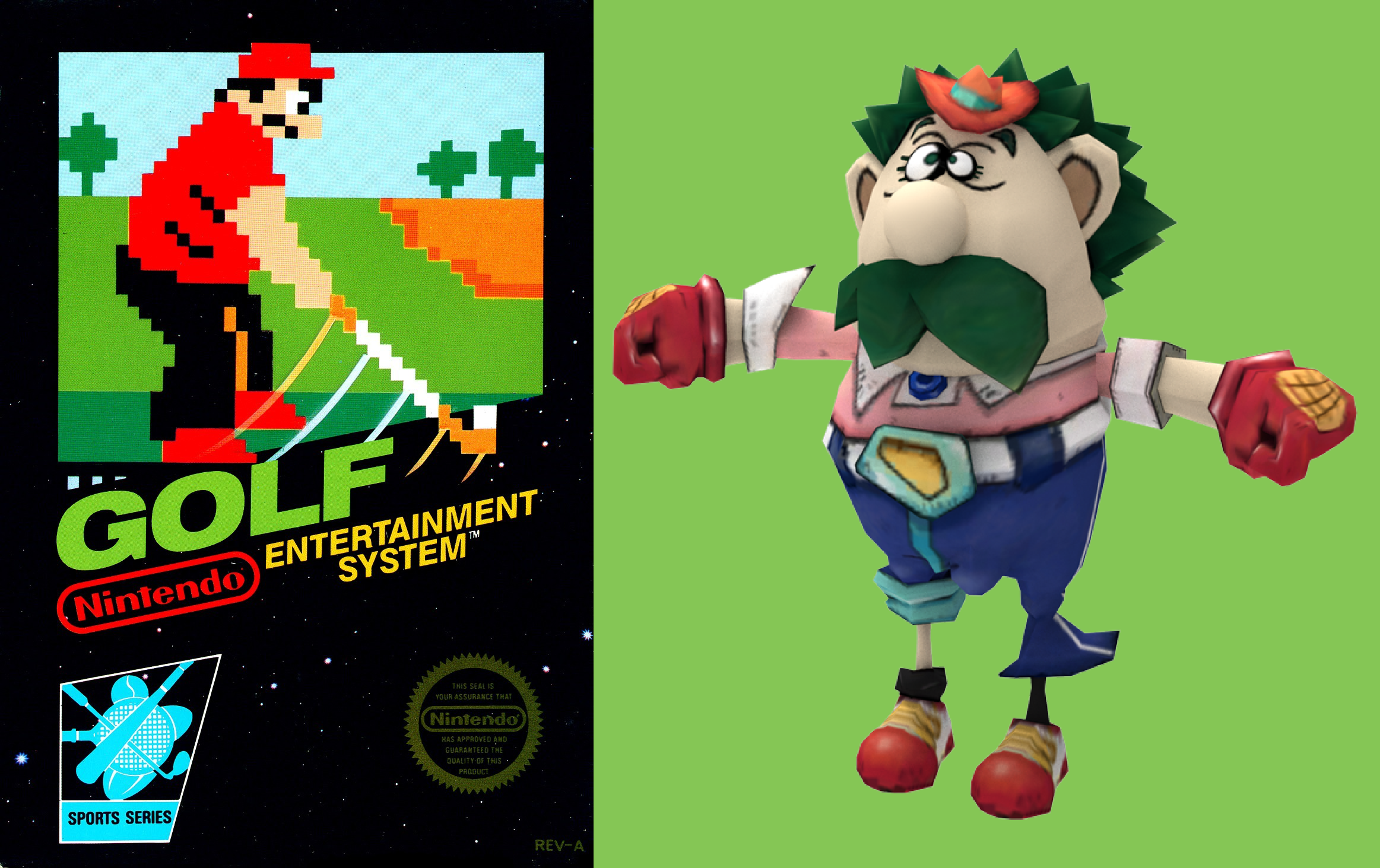 The playable character in the NES Golf game looks a great deal like Mario and is even referred to as being Mario in some materials. However, the actual game doesn’t make it clear that it’s him. Furthermore, the 2008 Nintendo nostalgia fest Captain Rainbow features this golfer dude as part of its cast of lesser-remembered Nintendo characters, but he’s called Ossan, after a Japanese term referring to a middle aged man.
