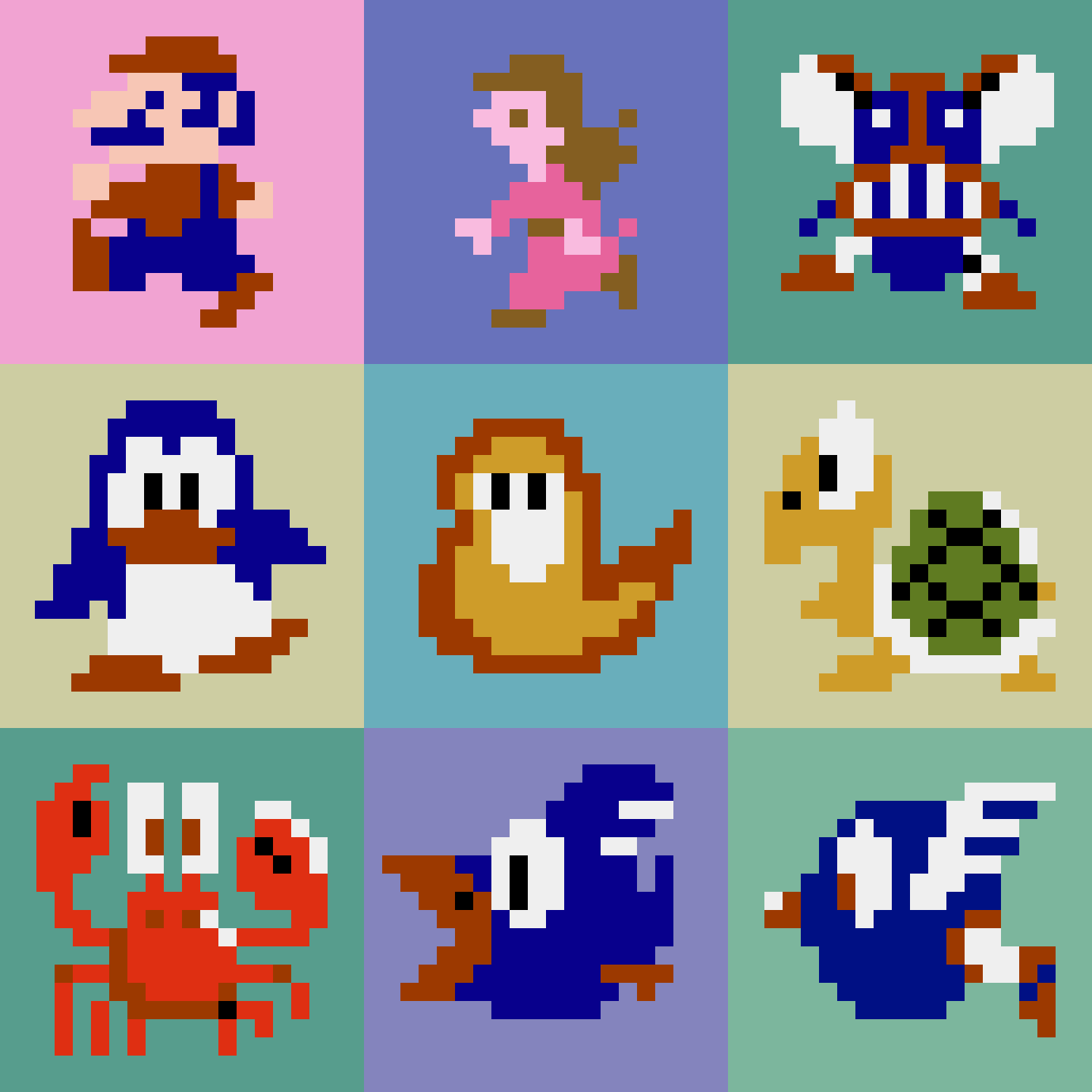 Clockwise from top-left: Mario, Pauline, Fighter Fly from Mario Bros., one of the penguins from Pinball (and he’s apparently named Penpen, but I’m not clear if that’s something specific to this game or if he’s named that in Pinball as well), the roving fireball from Donkey Kong, a Shellcreeper from Mario Bros., a Side Stepper from Mario Bros., the bird enemy from DK Jr., and then a different bird, Achilles, whom I mentioned in the Clu Clu Land entry, although I have to say I have no idea why his name is Achilles or if he’s supposed to be from some other game and I’m just not tracking it. Anyone?