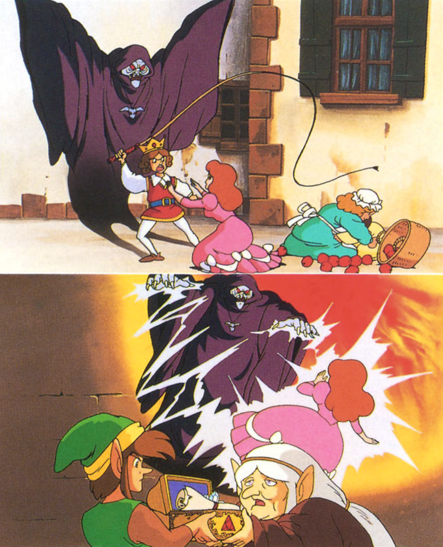 Top: I’m still mad this little prig wasn’t playable in a Hyrule Warriors game, whip and all. I can say it because I’m gay, but he looks really, really gay, and I dig a gay villain. Bottom: This, I think we can assume, is Impa literally explaining to Link the legend of Zelda — as in the one who was put under the sleeping spell and who cause the royal naming tradition.
