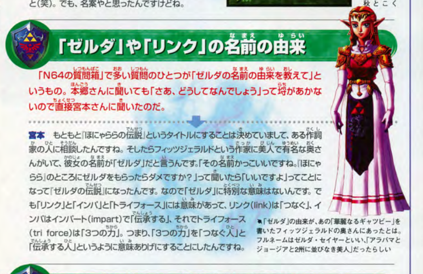 The accepted origin for Princess Zelda’s name is that series creator Shigeru Miyamoto named her after Zelda Sayre Fitzgerald, the artist wife of writer F. Scott Fitzgerald. It’s come up in multiple interviews, including this 2000 one promoting Majora’s Mask. And while I’m willing to agree that the Zelda Fitzgerald story is essentially true, there are some Miyamoto interviews where the chain of events that lead to the series name are stated slightly differently. For example, the January 1999 issue of the Japanese gaming mag 64 Dream (later Nintendo Dream) features interviews with the creators of Ocarina of Time, and as far as I know, it’s the first instance of Miyamoto explaining on the record how this series got its name.