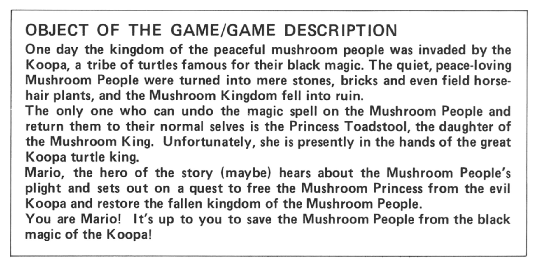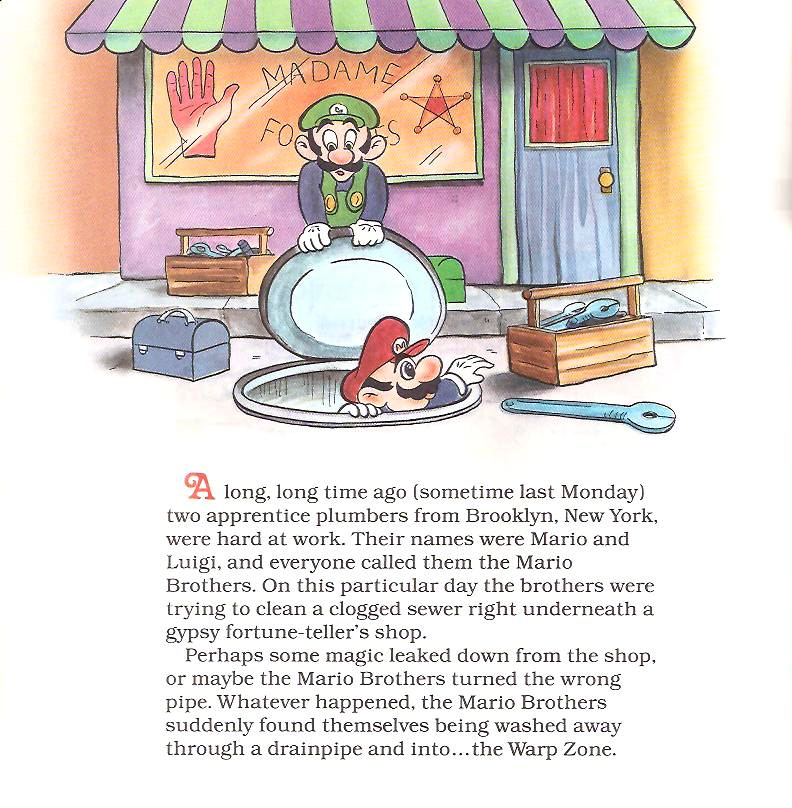 This assertion would later be reinforced by other adaptations, including the Super Mario Bros. Super Show! and the 1993 live-action Super Mario Bros. movie. That shouldn’t mean much, since both play very loose with the game canon, but I didn’t question it back in the day. I just assumed a book wouldn’t lie to me. Still, that’s perhaps an interesting position for me to take, seeing as how my family owned the video game Super Mario Bros., the instruction booklet to which did not mention Brooklyn once.