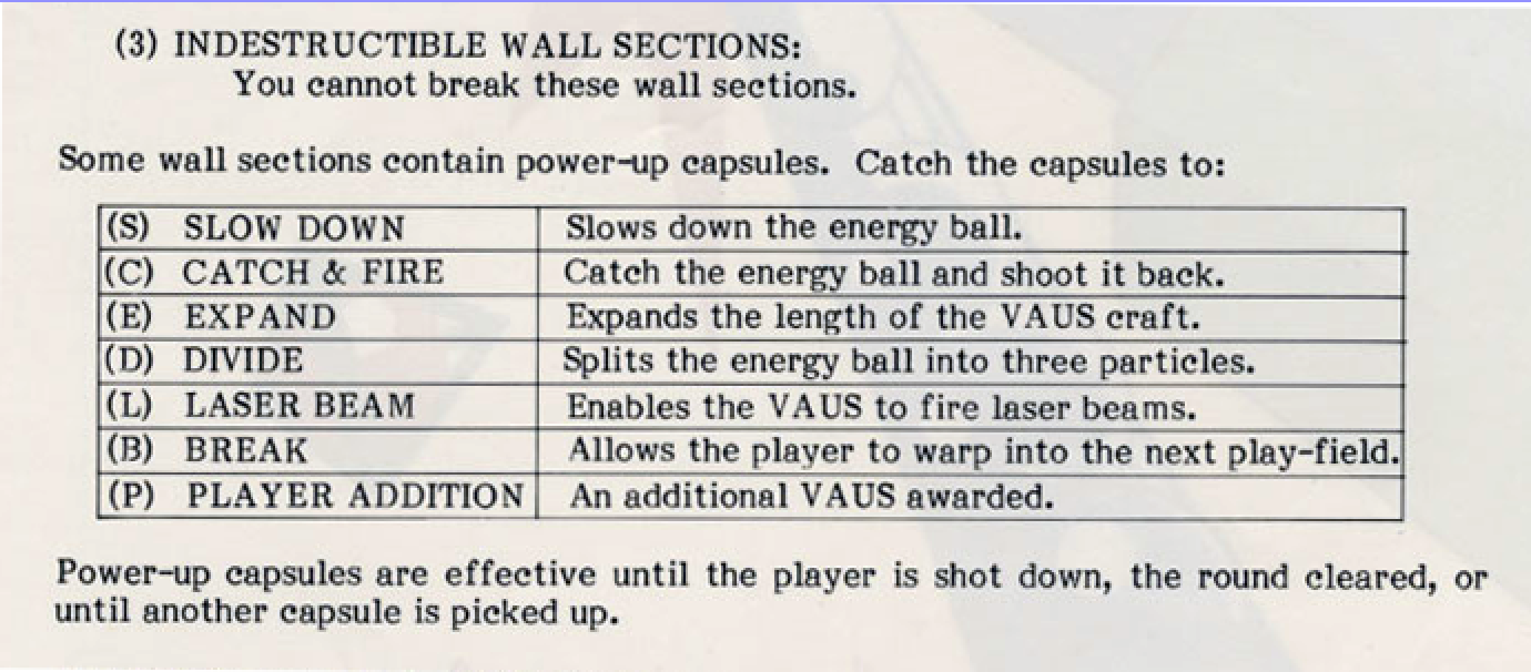 Slightly closer to what I’m looking for can be found in a 1986 flyer advertising Arkanoid. The hyphen is there, meaning that both words are being treated as a unit, but it’s being used as an adjective: “Some wall sections contain power-up capsules. [...] Power-up capsules are effective until the player is shot down, the round cleared, or until another capsule is picked up.” It is interesting to see the progression here, but it’s still not quite where we’d be in a few short years, when you wouldn’t need a noun after power-up — “Some walls may contain power-ups” versus “Some walls may contain power-up capsules,” if that makes sense.