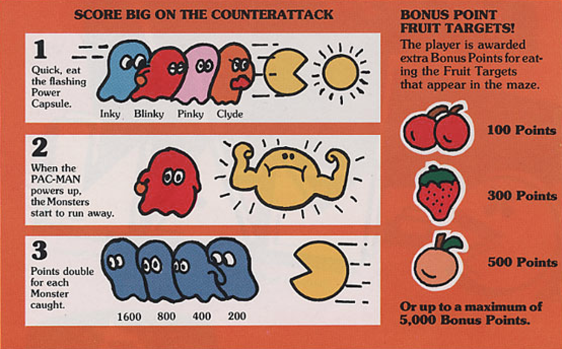 The Historical Dictionary of Science Fiction — a resource of which I was not aware until doing research for this post — has a timeline of textual evidence of the term being used in English. Although it says at the top of the page that “the first such item is usually considered to be the power pellets in Pac-Man,” its evidence for this does not quite match what I’m looking for as far as worse usage. A 1980 English-language flyer for Pac-Man uses an expression that better matches older English sense of power up, as a compound verb: “When Pac-Man powers up, the monsters start to run away.”